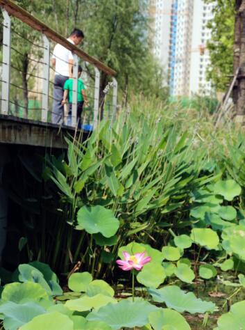 濕地園林一期景觀栽種了100多種植物,有旱柳、國(guó)槐等濟(jì)南本地樹種,還有荷花、蘆葦?shù)?0多種水生植物,良好的生態(tài)環(huán)境吸引了不少白鷺、??等鳥類棲息,“棹動(dòng)芙蓉落,船移白鷺飛”。
