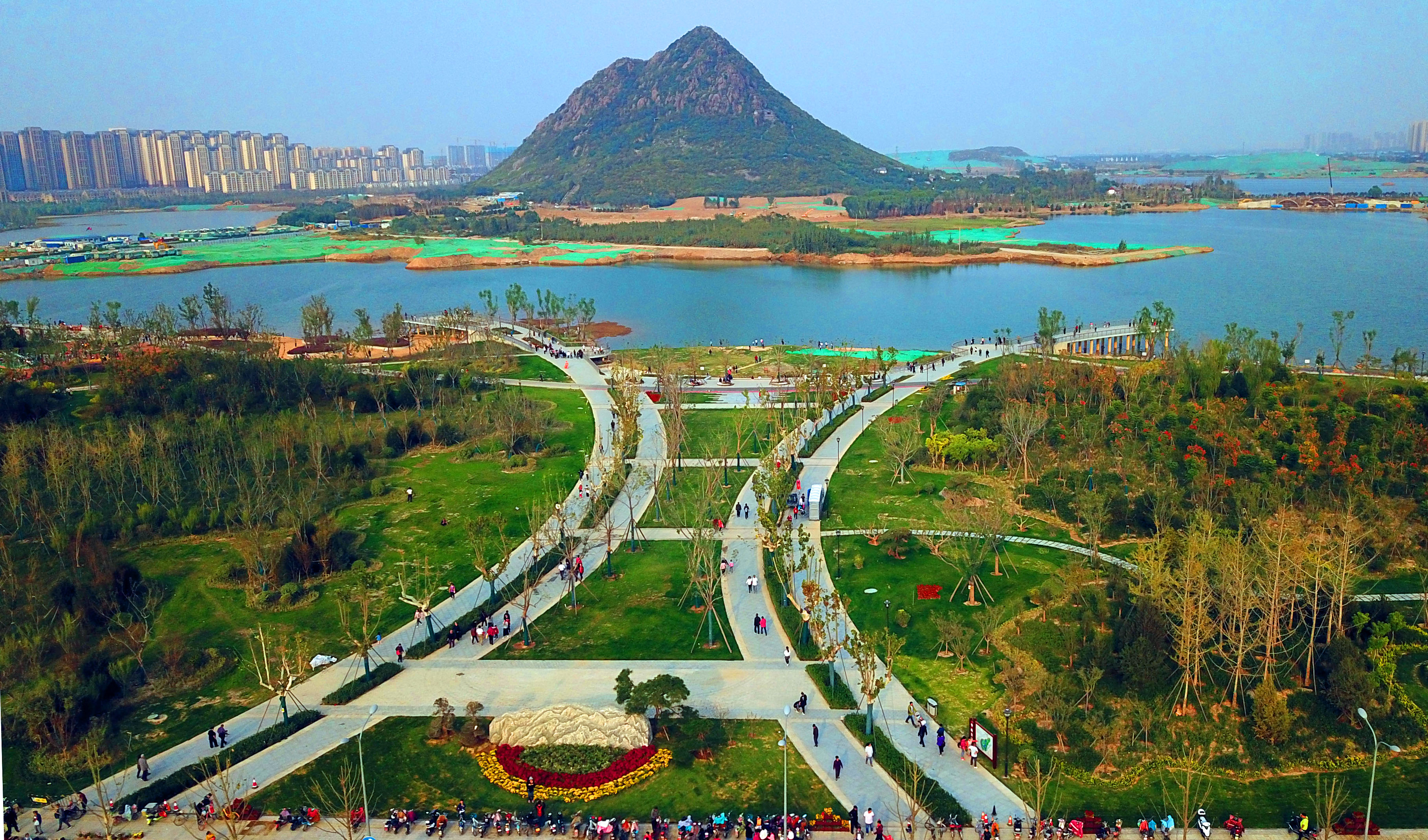 華山西、南、北三側(cè)的園林景觀綠化工程已基本竣工,景觀達(dá)到預(yù)期效果,華山東側(cè)的主體景觀建設(shè)已基本完成;