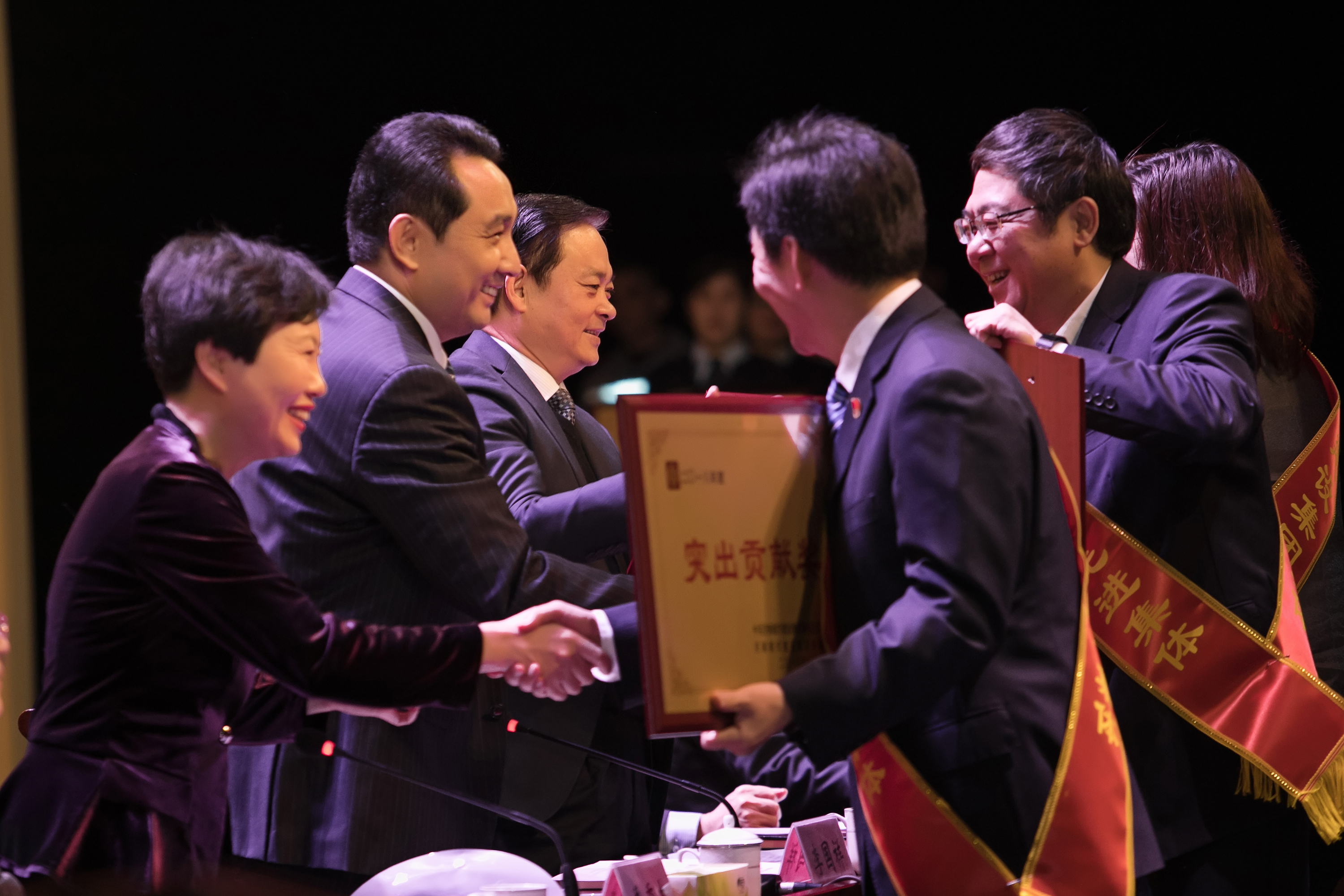 集團(tuán)領(lǐng)導(dǎo)為獲獎(jiǎng)單位頒發(fā)突出貢獻(xiàn)獎(jiǎng)