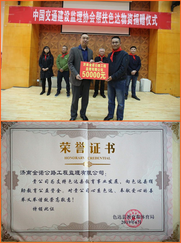 積極參與脫貧攻堅事業(yè)是一個有社會責(zé)任感的企業(yè)服務(wù)社會、回報社會的重要體現(xiàn)。不忘初心,牢記使命,濟南金諾公路工程監(jiān)理有限公司作為中國交通監(jiān)理協(xié)會的理事單位,將持之以恒的為貧困地區(qū)脫貧攻堅事業(yè)貢獻力量,持續(xù)關(guān)注色達(dá)孩子的教育和成長,盡企業(yè)的綿薄之力,為社會和諧進步和民族團結(jié)和諧貢獻力量。