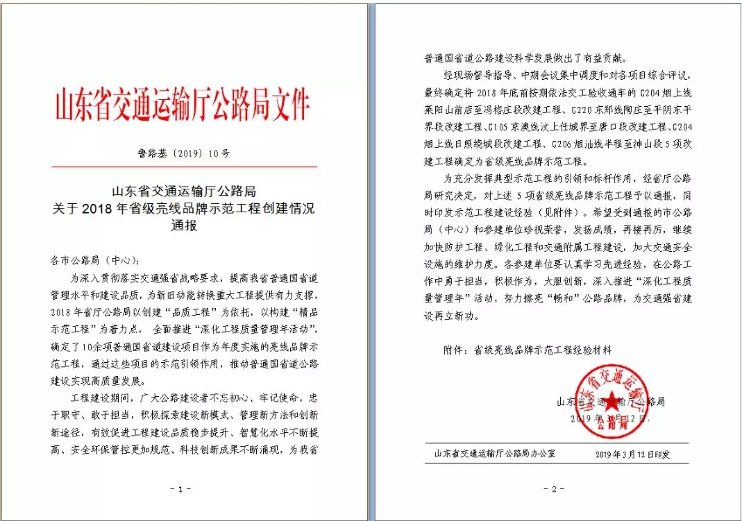 由濟(jì)南城市建設(shè)集團(tuán)所屬金諾公司負(fù)責(zé)代建管理、金衢公司負(fù)責(zé)設(shè)計、金曰等公司參與建設(shè)的G220東鄭線陶莊至平陰東平界段改建工程(簡稱“G220平陰南段改建工程”)喜獲山東省交通運(yùn)輸廳公路局“2018年省級亮線品牌示范工程”榮譽(yù)稱號。