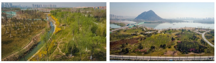 園區(qū)在設(shè)計(jì)建設(shè)時(shí)注重區(qū)分功能性和體驗(yàn)性,華山北面部分定位為濕地展示區(qū),展示濕地的景觀特性,融合體驗(yàn)式科教,綠化景觀多為豐富層疊狀,各類植物栽種交錯(cuò)有致,層次豐富,移步至華山東面及東南面,這片區(qū)域定位為山林文娛區(qū),結(jié)合北臥牛山和驢山形成特色山林景觀,靠近山體部分的植物景觀結(jié)構(gòu)上則多以大開(kāi)大合景觀為主,大片草地開(kāi)闊寬廣,風(fēng)格迥異,賞玩別有趣味。