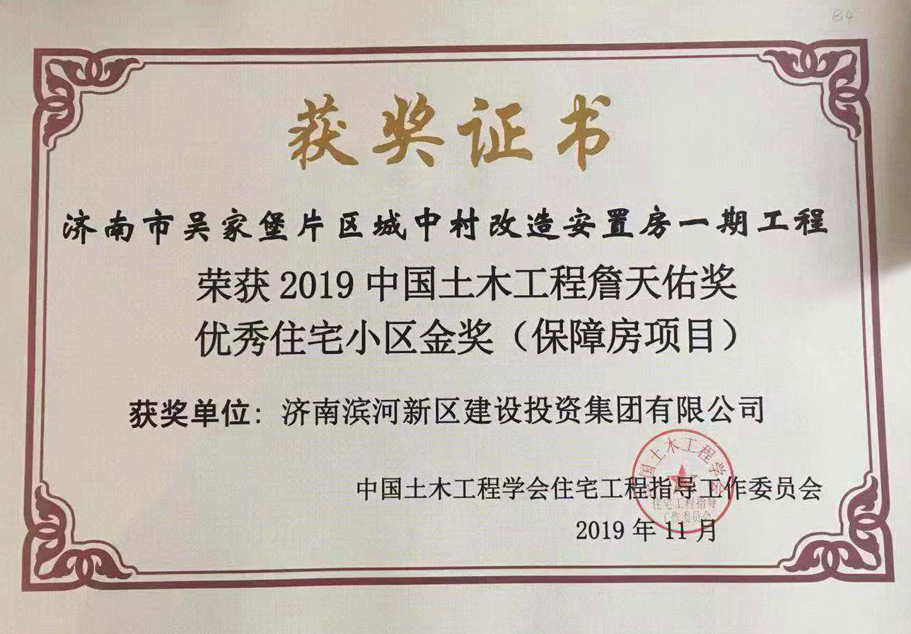 弘揚(yáng)工匠精神,打造精品工程。作為濟(jì)南市第一個(gè)多村整合的城中村改造項(xiàng)目,近日,由濟(jì)南城市建設(shè)集團(tuán)負(fù)責(zé)建設(shè)的吳家堡片區(qū)城中村改造安置房一期工程(以下簡(jiǎn)稱吳家堡安置房一期)榮獲2019中國(guó)土木工程詹天佑獎(jiǎng)優(yōu)秀住宅小區(qū)金獎(jiǎng)。