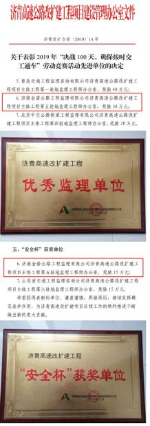 近日,由濟南城市建設(shè)集團所屬濟南金諾公路工程監(jiān)理有限公司承建的濟青高速第五駐地辦榮獲2019年山東省總工會“工人先鋒號”榮譽稱號, 同時,在2019年度該項目“決戰(zhàn)100天,確保按時交工通車”勞動競賽活動中表現(xiàn)突出,榮獲2019年濟青高速改擴建工程“優(yōu)秀監(jiān)理單位”、“安全杯”獲獎單位榮譽稱號;其中,項目負責(zé)人獲得“優(yōu)秀駐地監(jiān)理工程師”稱號, 6位同志獲得“監(jiān)理單位先進個人”稱號, 2位同志獲得“監(jiān)理單位安全生產(chǎn)先進個人” 稱號,共獲得專項獎勵49.6萬元。