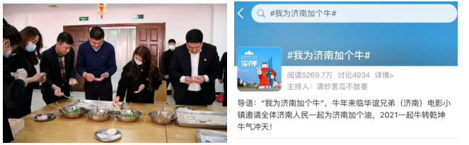 2021春節(jié)期間,華誼兄弟(濟(jì)南)電影城投資開(kāi)發(fā)有限公司開(kāi)展了年終總結(jié)表彰會(huì)、包餃子迎新年、我為濟(jì)南加個(gè)牛等一系列新春活動(dòng),喜迎牛年新春佳節(jié)的到來(lái),營(yíng)造了喜慶祥和的節(jié)日氛圍。