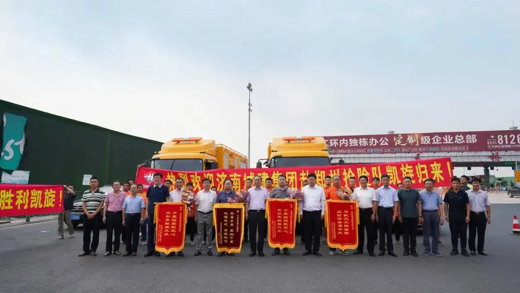 7月25日一早,城建集團(tuán)公司應(yīng)急搶險(xiǎn)隊(duì)經(jīng)過休整準(zhǔn)備返濟(jì)時(shí),鄭州惠濟(jì)區(qū)老百姓自發(fā)來到現(xiàn)場(chǎng),為救援隊(duì)員們送上鮮花、食品等禮物,拉起“歡送山東省住建廳救援隊(duì)英雄們平安回家”“向搶險(xiǎn)救災(zāi)的英雄致敬”的條幅,夾道歡送應(yīng)急救援隊(duì)。