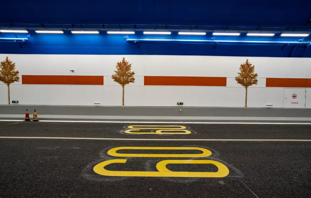 保持隧道主體工程結(jié)構(gòu)不變,通過增加裝飾,實(shí)現(xiàn)整體設(shè)計(jì)提升。隧道南北出口聲屏障以“歲歲九曲彎”和“歲歲安瀾”為設(shè)計(jì)主題,以中國傳統(tǒng)裝飾紋樣呈現(xiàn),夜晚還將呈現(xiàn)“日出黃河”的燈光效果。添加“流動(dòng)”與“水紋”的造型體現(xiàn)了黃河穿越之美,在隧道內(nèi)采用3D打印貼膜工藝?yán)L制白楊樹(寓意堅(jiān)韌、表達(dá)力求上進(jìn)的精神),以緩解駕駛員視覺疲勞。同時(shí)以黃河星空為題,中間段頂部弧線的燈光表現(xiàn)黃河穿越之感,暖色照明設(shè)計(jì)表現(xiàn),感受黃河星空光線流動(dòng)之美。