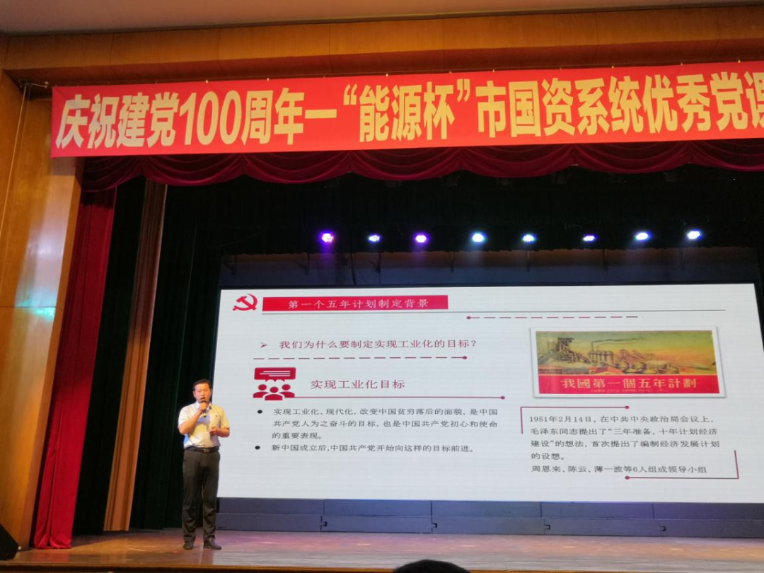 為慶祝中國共產(chǎn)黨成立100周年,扎實(shí)推進(jìn)黨史學(xué)習(xí)教育,6月2日,由濟(jì)南市國資委主辦、濟(jì)南能源集團(tuán)承辦的“能源杯”市國資系統(tǒng)優(yōu)秀黨課匯報(bào)展示觀摩會在北郊熱電廠禮堂舉行。集團(tuán)選送黨課《第一個(gè)五年計(jì)劃》,參加現(xiàn)場觀摩評比并榮獲三等獎。