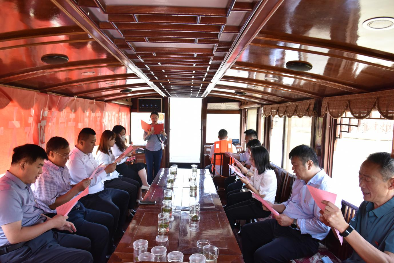 活動中,黨員干部模擬再現(xiàn)嘉興南湖紅船會議場景,圍繞“喜迎二十大 永遠(yuǎn)跟黨走——緬懷革命先烈 弘揚紅船精神 ”主題開展朗誦活動。