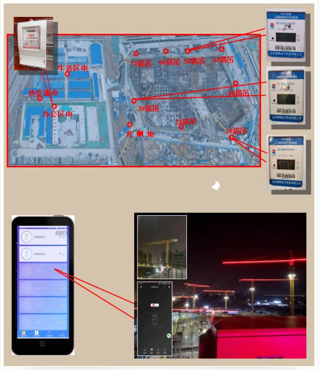 在房建類項目建設中,通過用電分區(qū)計量,將施工用電,辦公用電,生活用電均分開計量,現(xiàn)場8臺塔吊,均單獨計量,項目安排專人每月底抄表,做好用電臺賬,并統(tǒng)計分析,糾偏查因。同時通過項目部塔吊大燈遠程智能控制系統(tǒng),保證施工現(xiàn)場無人施工時能第一時間利用APP使塔吊鏑燈,節(jié)約能源。