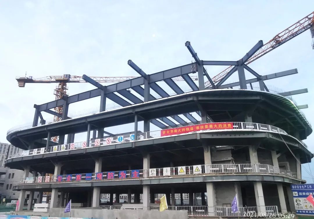 在主體結構施工中,采用鋼構框架安裝,施工采用BIM排布鋼構安裝順序,鋼構組件抵達施工現(xiàn)場后施工人員按照編號快速有效拼接。樓板采用樓承板安裝,在免除支模板施工同時也提高了安全性加快了施工進度,實現(xiàn)了安全經濟環(huán)保的綜合效益。