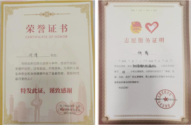 在疫情防控期間,何倩主動請纓,逆行出征,協(xié)助桿石橋街道完成核酸檢測、物資搬運等疫情防控工作,得到了社區(qū)的高度認(rèn)可。