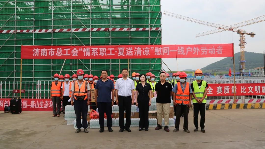 8月12日上午,濟(jì)南市總工會(huì)副主席申世平帶隊(duì)到中科院濟(jì)南科創(chuàng)城產(chǎn)業(yè)園項(xiàng)目現(xiàn)場(chǎng),為一線(xiàn)職工送去防暑降溫物品,慰問(wèn)一線(xiàn)建設(shè)者,市總工會(huì)宣教部二級(jí)調(diào)研員張昭力,建設(shè)集團(tuán)黨委副書(shū)記鐘善良,集團(tuán)工會(huì)相關(guān)負(fù)責(zé)同志參加活動(dòng)。