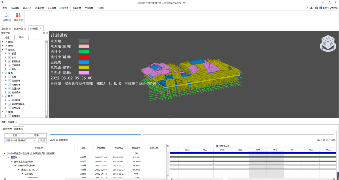 結(jié)合項(xiàng)目結(jié)構(gòu)超限設(shè)計(jì)的實(shí)際,為從根本上解決因后澆帶設(shè)置過多而產(chǎn)生的進(jìn)度、質(zhì)量、安全文明問題,論證實(shí)施了“跳倉法”施工工藝,按“塊料規(guī)劃、塊料施工、分層澆注、整體成型”的原則施工,加大資源調(diào)配力度,在節(jié)約工期的同時(shí),實(shí)現(xiàn)文明施工、質(zhì)量控制、進(jìn)度管理有益結(jié)合。深入推進(jìn)BIM全過程管理應(yīng)用,實(shí)現(xiàn)以BIM模型為基礎(chǔ)的三維圖紙審查、碰撞檢測(cè)、凈高分析、設(shè)計(jì)方案比選、施工模型深化、管線綜合、進(jìn)度模擬、數(shù)據(jù)共享等功能,為施工方案編制論證、進(jìn)度檢查反饋、圖紙審查評(píng)價(jià)等多方面提供了多維度的強(qiáng)大支持。