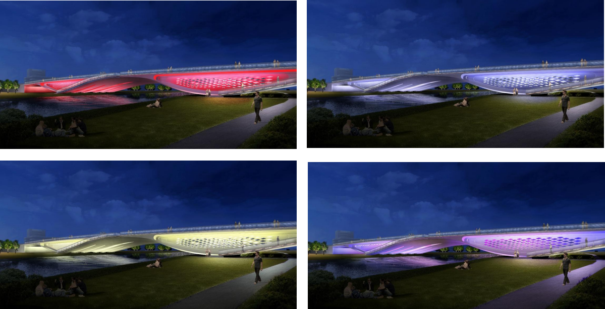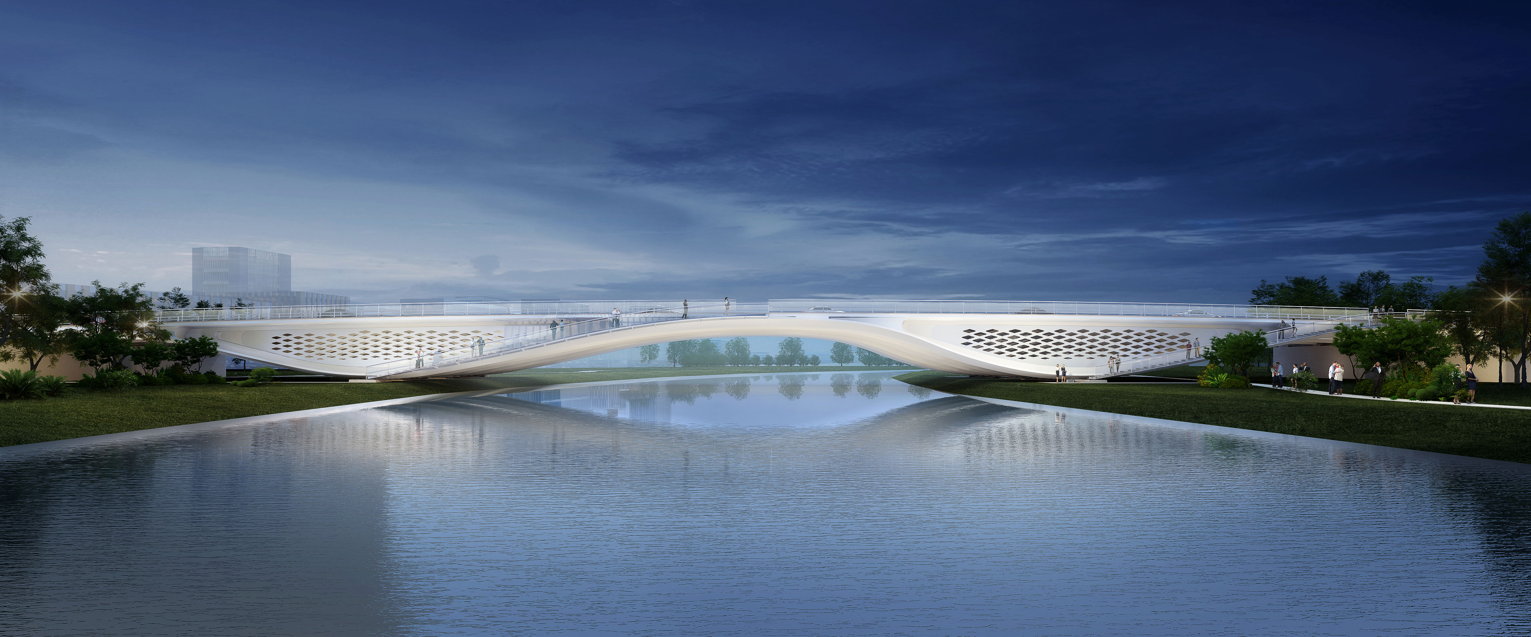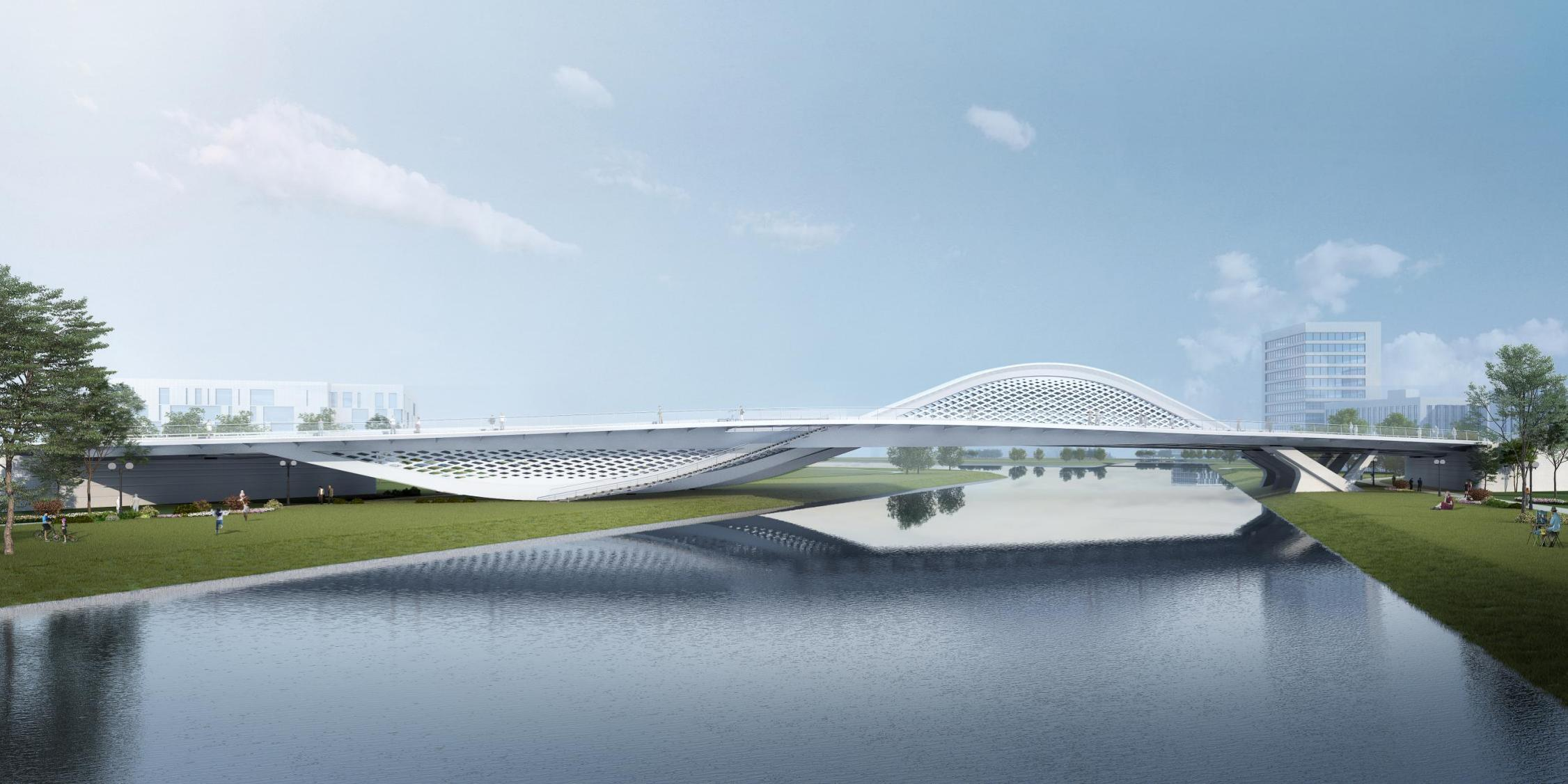橫一路、橫二路大寺河橋作為起步區(qū)規(guī)劃的第一批景觀橋梁,由濟南城市建設(shè)集團有限公司受委托建設(shè),兩座橋梁由世界著名橋梁設(shè)計師Marc MIMRAM先生主設(shè)計,通過研究濟南的歷史和文化,以泉與太極這個設(shè)計為根基,將泉城的剛中有柔、柔中帶剛,與太極互為印證,力與美相結(jié)合,完成兩座景觀橋梁的設(shè)計。