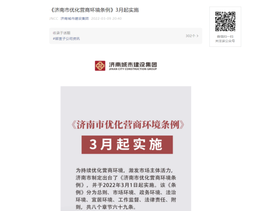 公司重點(diǎn)宣傳《條例》以及打造法治化營商環(huán)境的重大舉措、優(yōu)秀成果。組織各部門開展一次以《條例》為主題的理論學(xué)習(xí)活動,不斷強(qiáng)化國企人員優(yōu)化營商環(huán)境的理念和措施。同時,積極參加濟(jì)南市《條例》知識網(wǎng)上有獎答題活動,利用公眾號對《條例》打造市場環(huán)境、政務(wù)環(huán)境、法治環(huán)境、宜居環(huán)境等方面進(jìn)行宣傳,報道《條例》貫徹實施過程中的措施和成效,以提升《條例》群眾知曉率,營造全社會參與維護(hù)營商環(huán)境的良好輿論氛圍。
