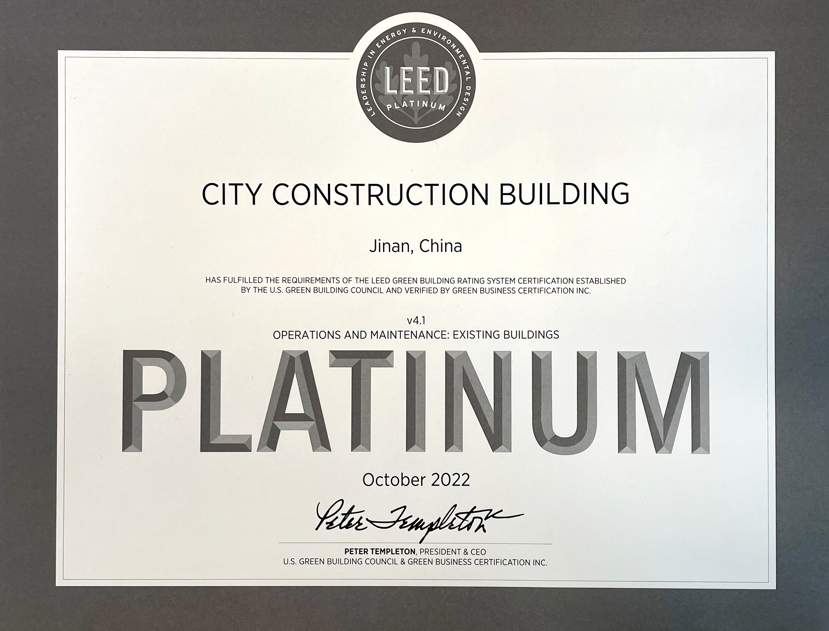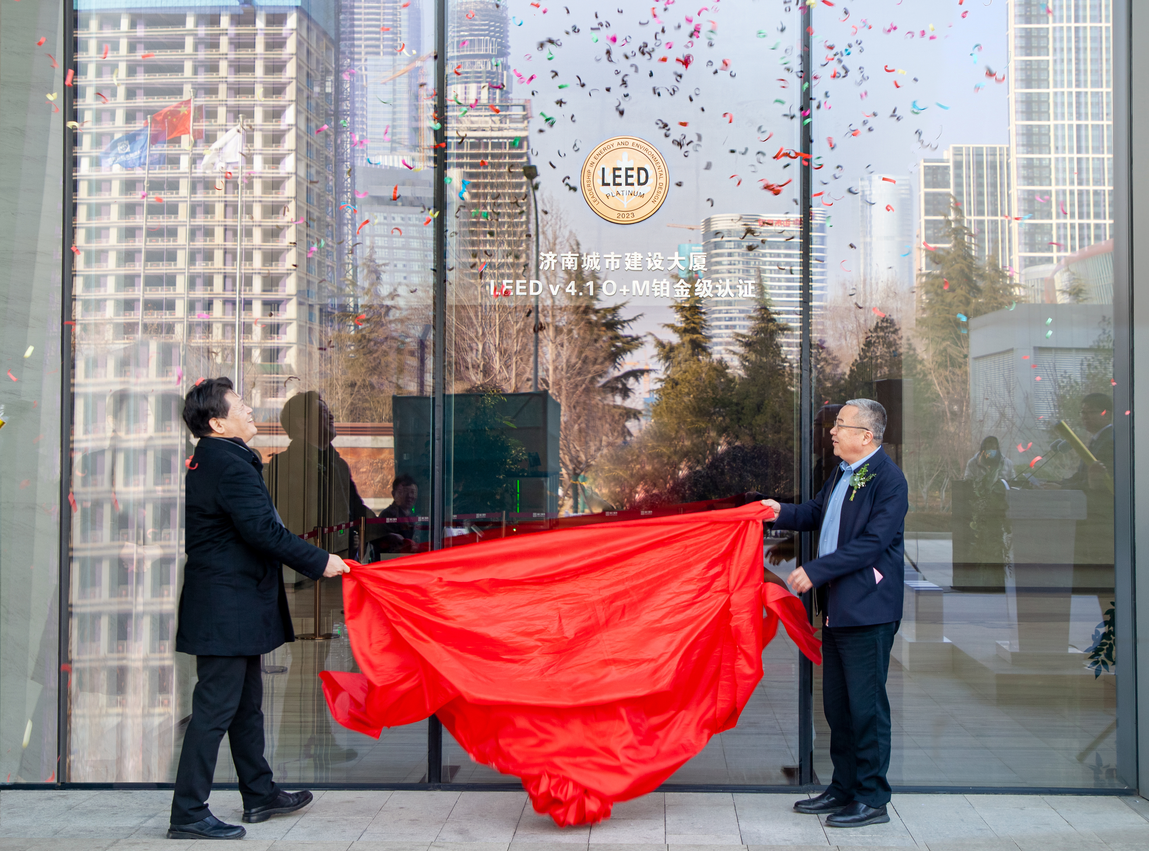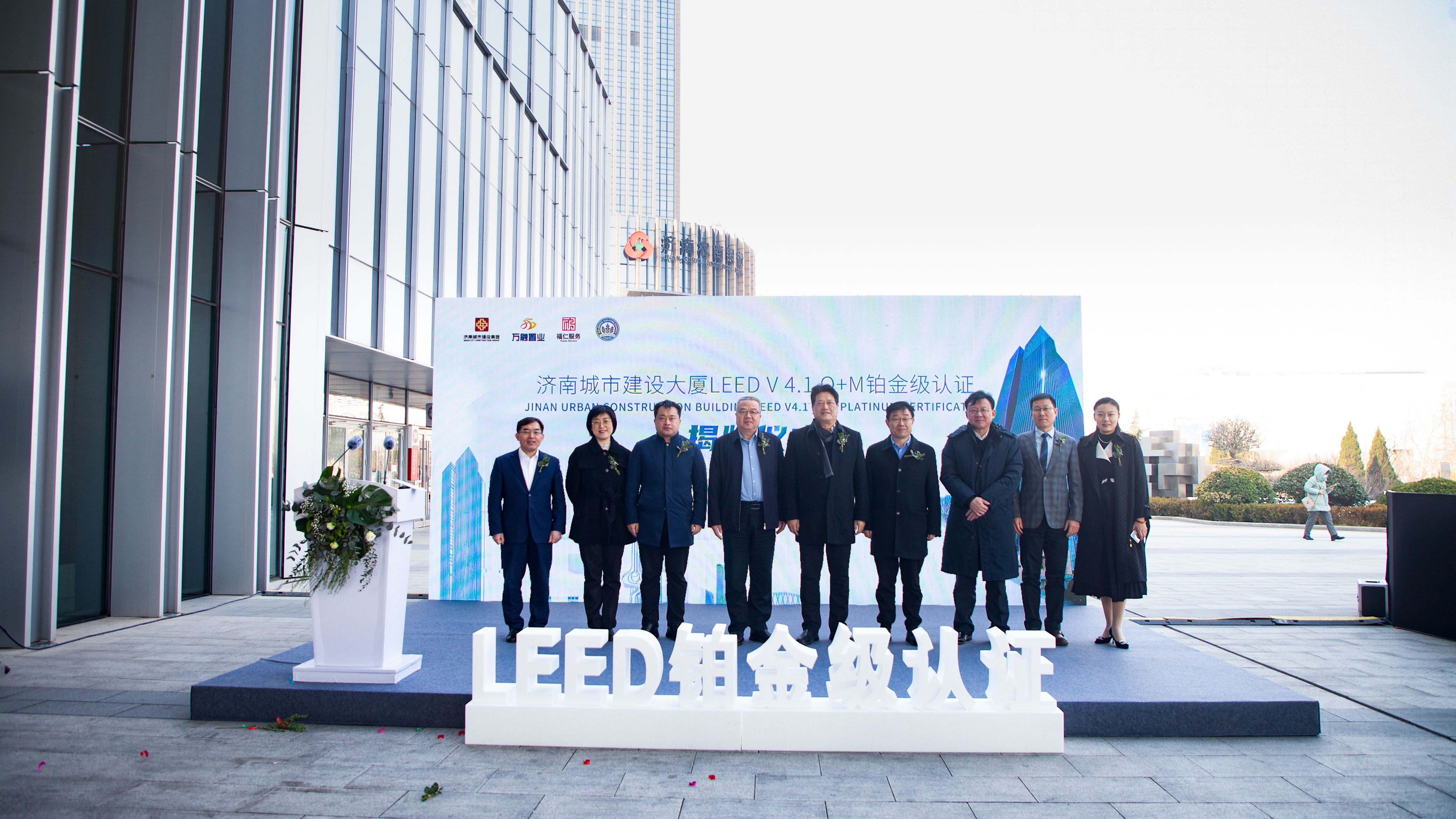 2月16日上午,濟(jì)南城市建設(shè)大廈LEED v 4.1 O+M鉑金級認(rèn)證揭牌儀式舉行。市城鄉(xiāng)和住房建設(shè)局副局長張慶華,市住建局綠色建筑節(jié)能與科技處處長滿意,建設(shè)集團(tuán)咨詢安玉坤,副總經(jīng)理徐文東,副總經(jīng)理楊曉東,副總經(jīng)理侯濤出席活動。萬融置業(yè)、福仁服務(wù)相關(guān)負(fù)責(zé)同志參加活動。
