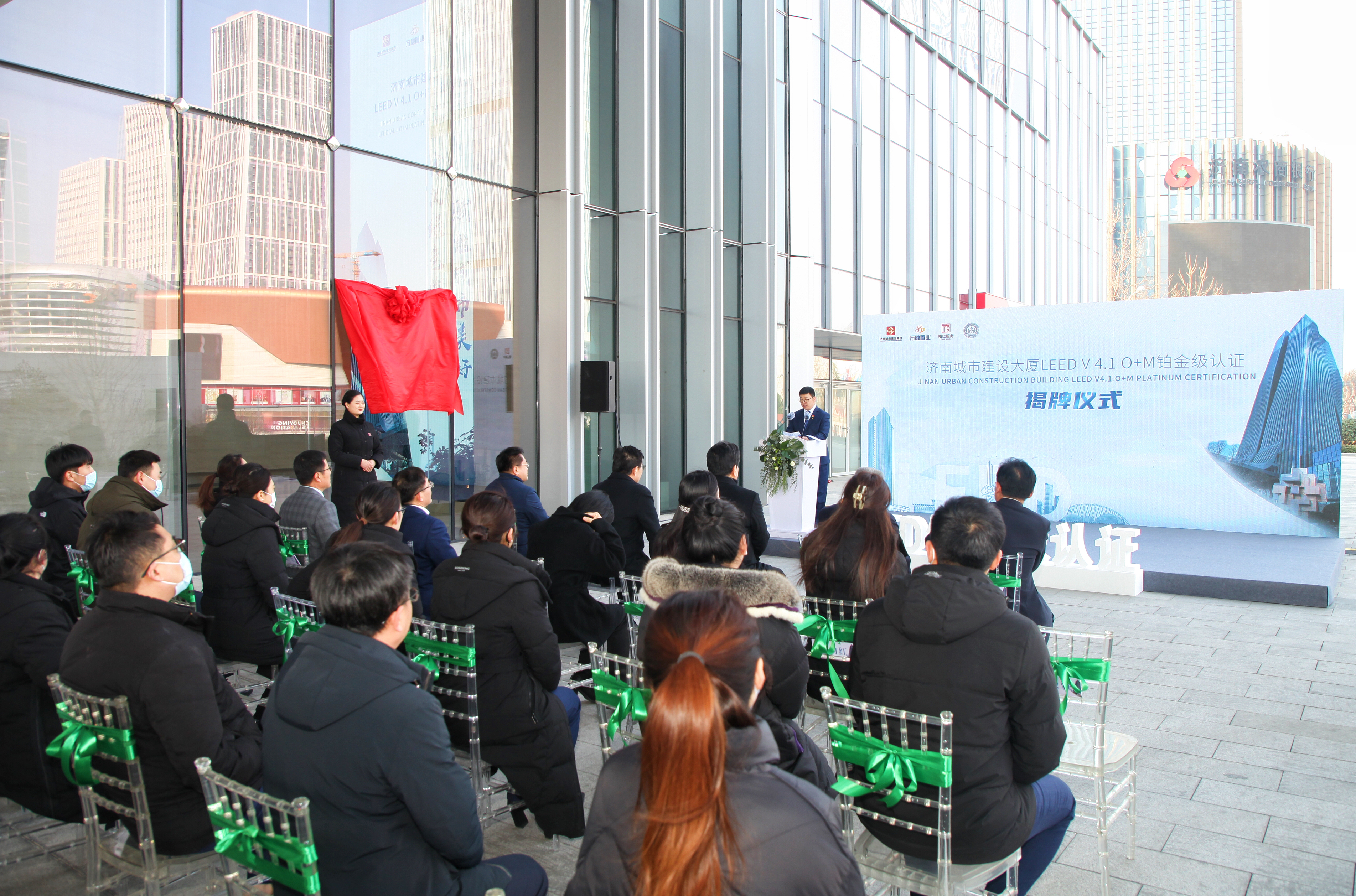 儀式上,市住建局副局長張慶華和建設(shè)集團(tuán)副總經(jīng)理徐文東共同為認(rèn)證標(biāo)志揭牌。美國綠色建筑委員會北亞區(qū)副總裁王婧通過視頻為認(rèn)證揭牌活動送上祝福。