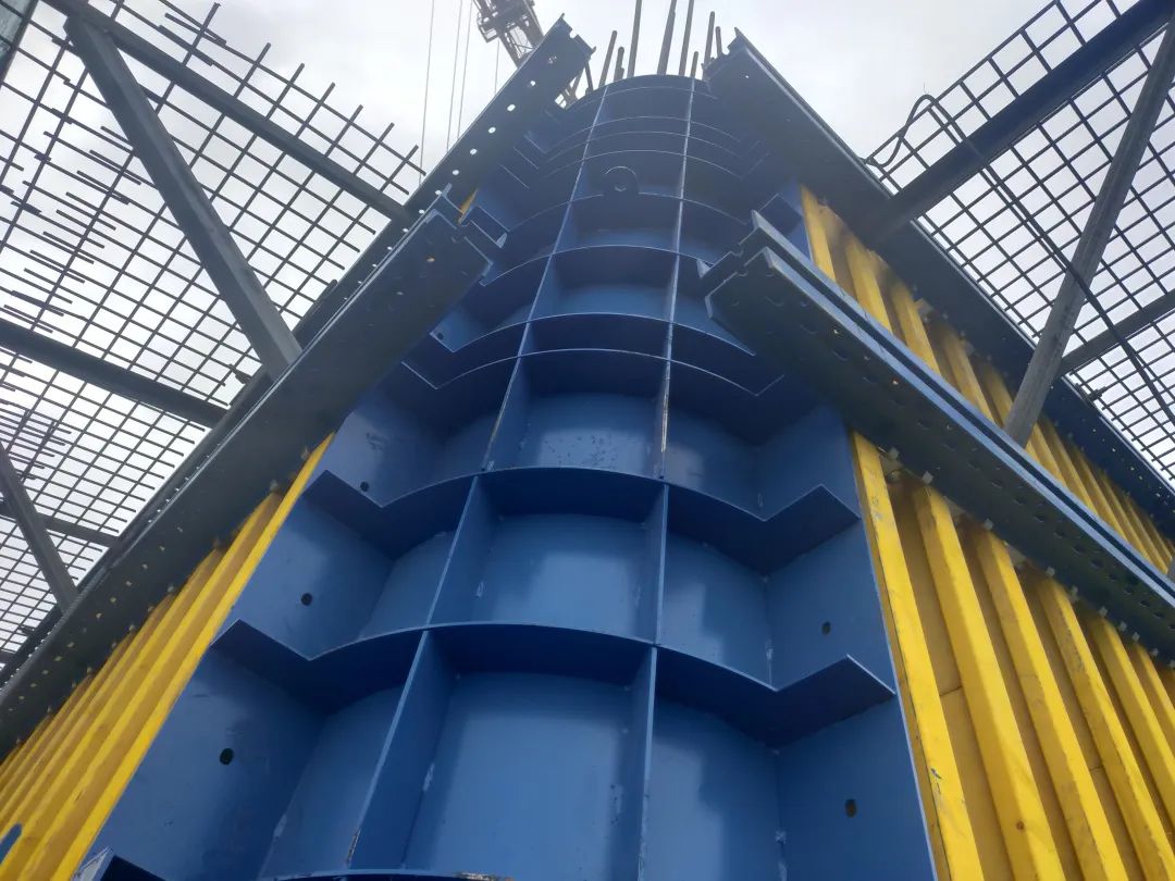 新建黃河大橋采用新橋與老橋并建的形式,在老橋下游33.5米處復(fù)線姊妹橋,兩個(gè)主塔設(shè)計(jì)高度168米,形狀為寶瓶型。“寶瓶”瓶腹處呈圓弧狀,主塔最外沿幾乎與老橋“肩并肩”,傳統(tǒng)翻模工藝需要大量的鋼管搭建支架予以支撐,空間狹窄,施工人員就更難對模板進(jìn)行有效加固。