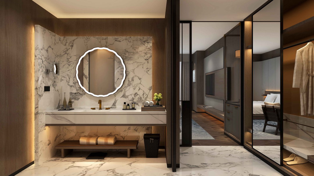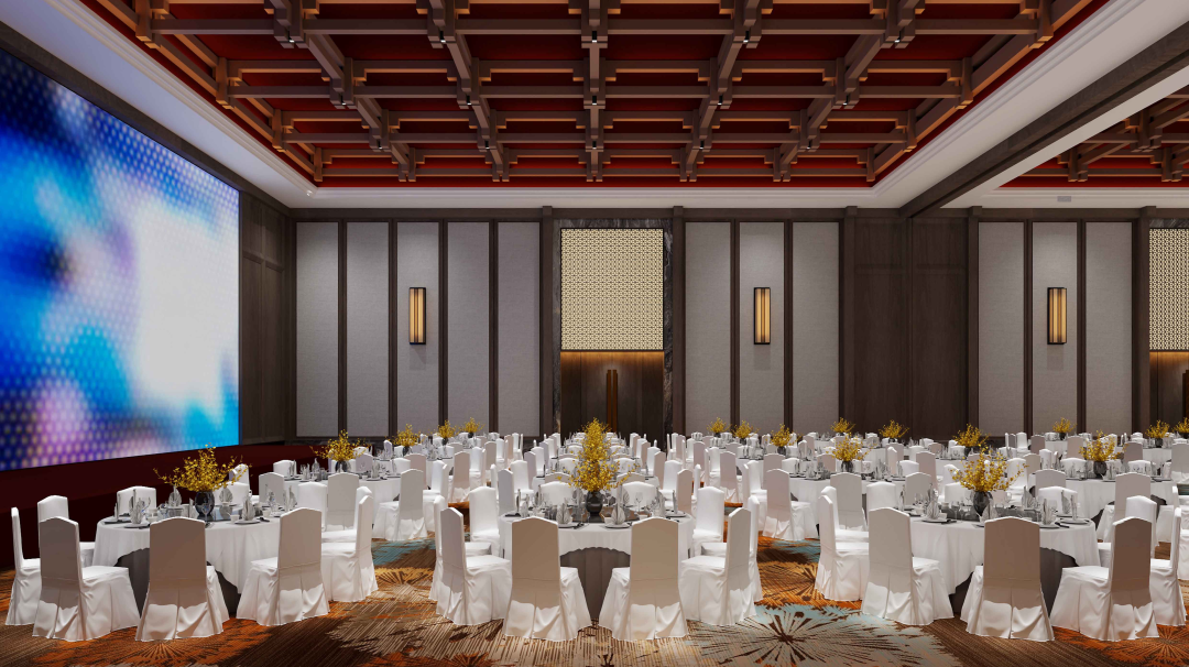 酒店室內(nèi)宴會及會議總面積達5000平方米,酒店內(nèi)最大無柱式多功能宴會廳面積達1100平方米,配備P2.5高清LED顯示屏,能夠承接60桌宴會及千人會議;酒店共有客房352套,以及配有280平方米行政酒廊及各類型餐廳,酒店還配備健身房、瑜伽室、乒乓球室及室內(nèi)泳池,康樂區(qū)域總面積超過2300平方米。