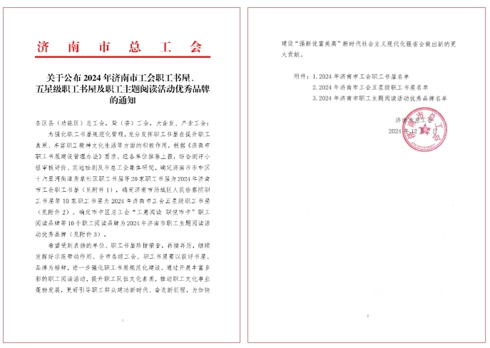 近日,市總工會(huì)公布了《關(guān)于公布2024 年濟(jì)南市工會(huì)職工書屋、五星級(jí)職工書屋及職工主題閱讀活動(dòng)優(yōu)秀品牌的通知》,濟(jì)南城市建設(shè)集團(tuán)有限公司職工書屋獲評(píng)濟(jì)南市工會(huì)五星級(jí)職工書屋。