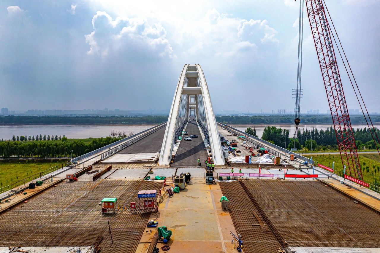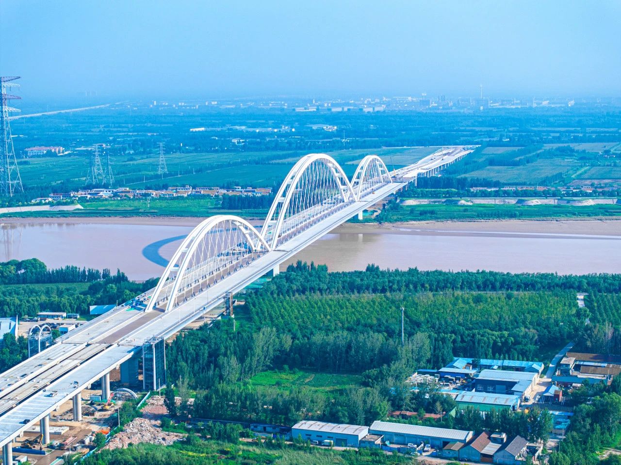 濟南黃河齊魯大橋為黃河之上首座下承式網(wǎng)狀系桿拱橋,主跨徑達420米、寬60.7m,創(chuàng)世界同類型橋梁最大跨徑、最大梁寬,其400Mpa超高應力幅拉索在橋梁建設領域首次研發(fā)應用。