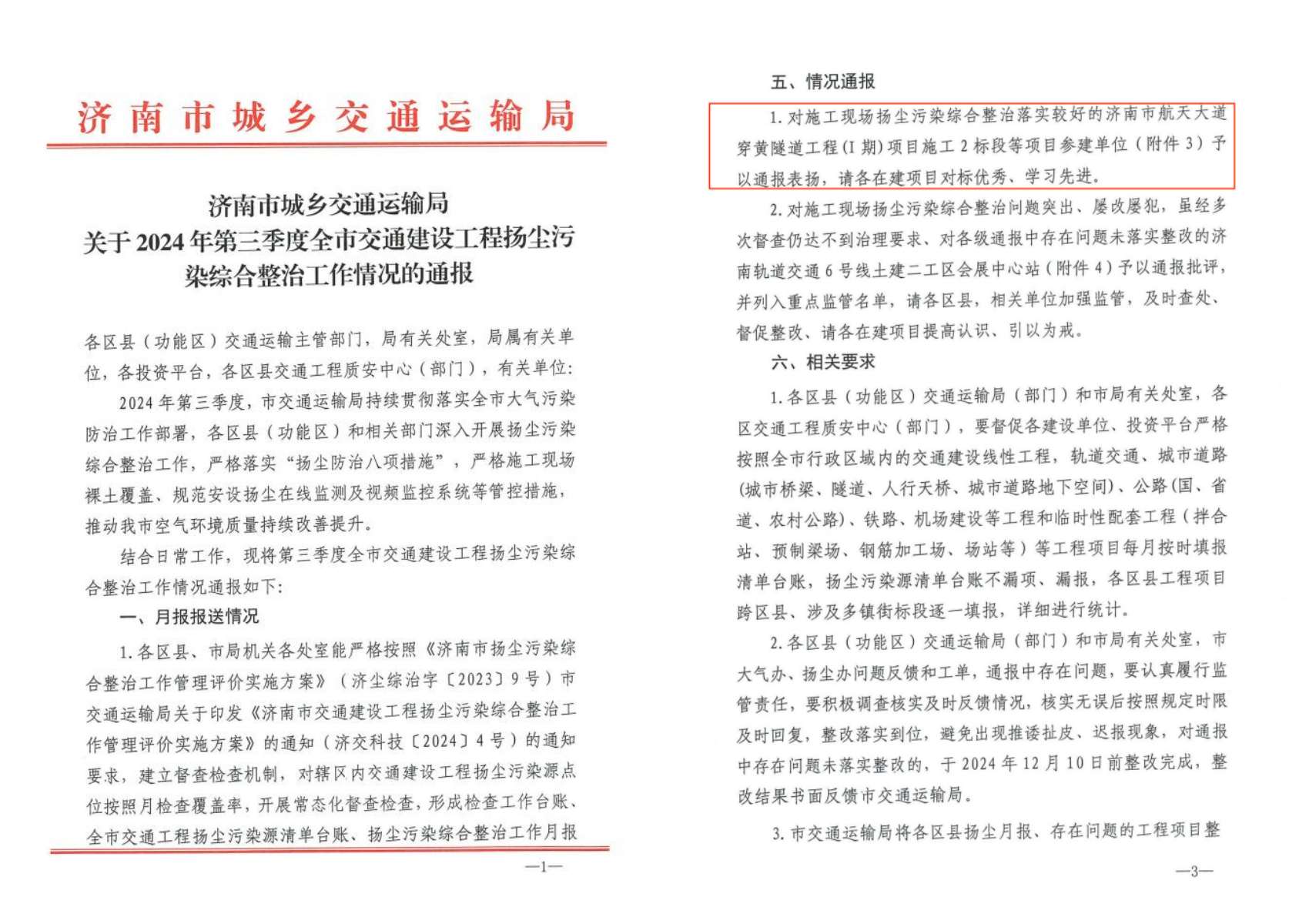 近日,濟南市城鄉(xiāng)交通運輸局公布了2024年第三季度交通建設工程揚塵治理通報,建設集團投資建設的濟南市航天大道穿黃隧道工程(I期)項目施工2標段脫穎而出,被予以通報表揚,該標段由中交隧道工程局有限公司承建。