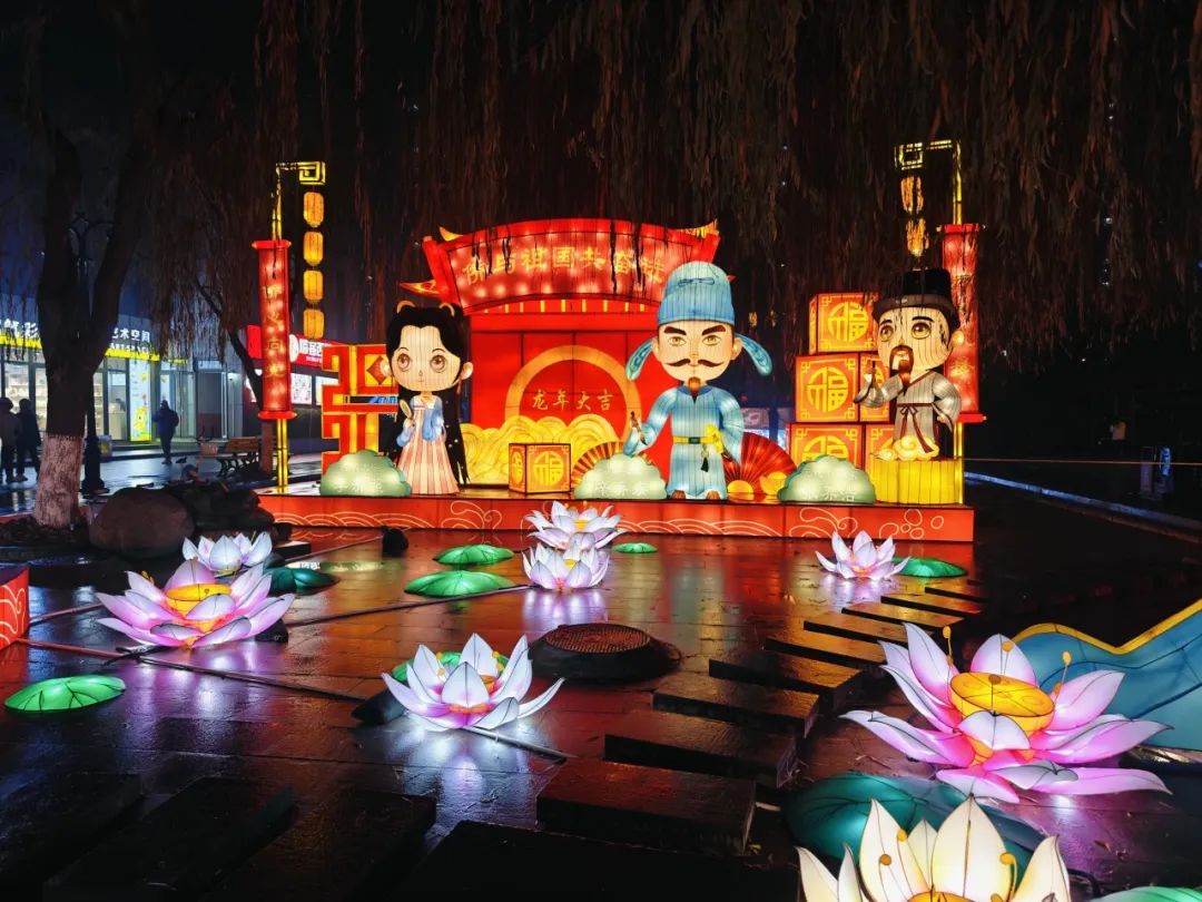 本屆燈會將延續(xù)往屆的點位,沿“十字”主干道設(shè)置燈組。“縱尋”龍之圖騰——群龍賀春,閃耀印象濟南·泉世界。主干道泉印路共有四大觀賞亮點,分別是“荷”為貴、張燈結(jié)彩、瑞龍迎春、齊魯名士。“瑞龍迎春”象征祥瑞的五彩神龍翹首相迎,龍頭一抬,好運自來。齊魯名士共有兩個展出點位,濟南人的榮耀和驕傲,我們的 “二安文化”作為本屆燈會的一大“看點”就在這個部分展出,在湖畔荷塘中,Q版的齊魯名士們,引得現(xiàn)場市民、游客紛紛拍照打卡。