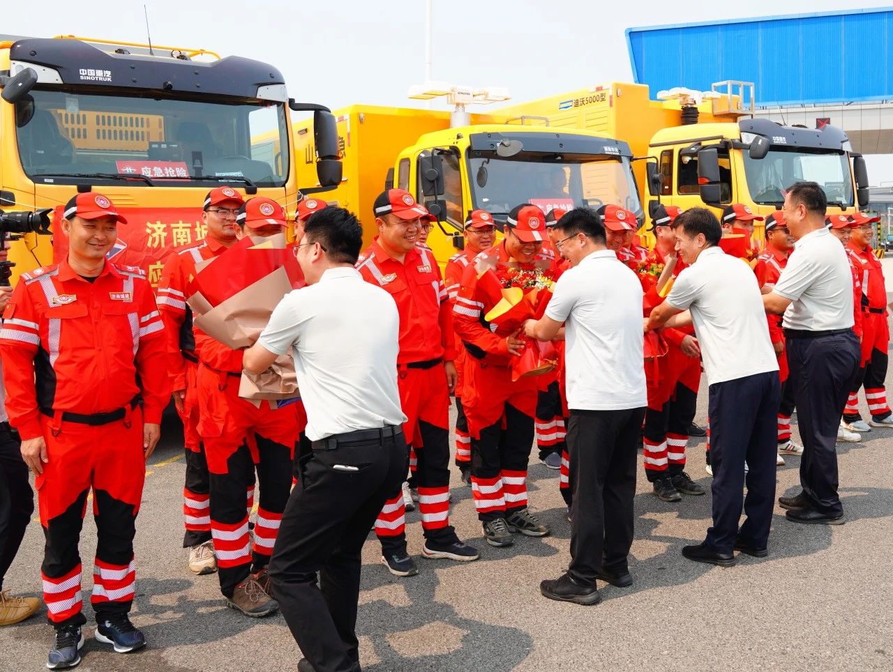 7月11日,馳援臨沂市搶險救災的濟南城建集團公司應急救援隊35名隊員圓滿完成任務返回濟南。