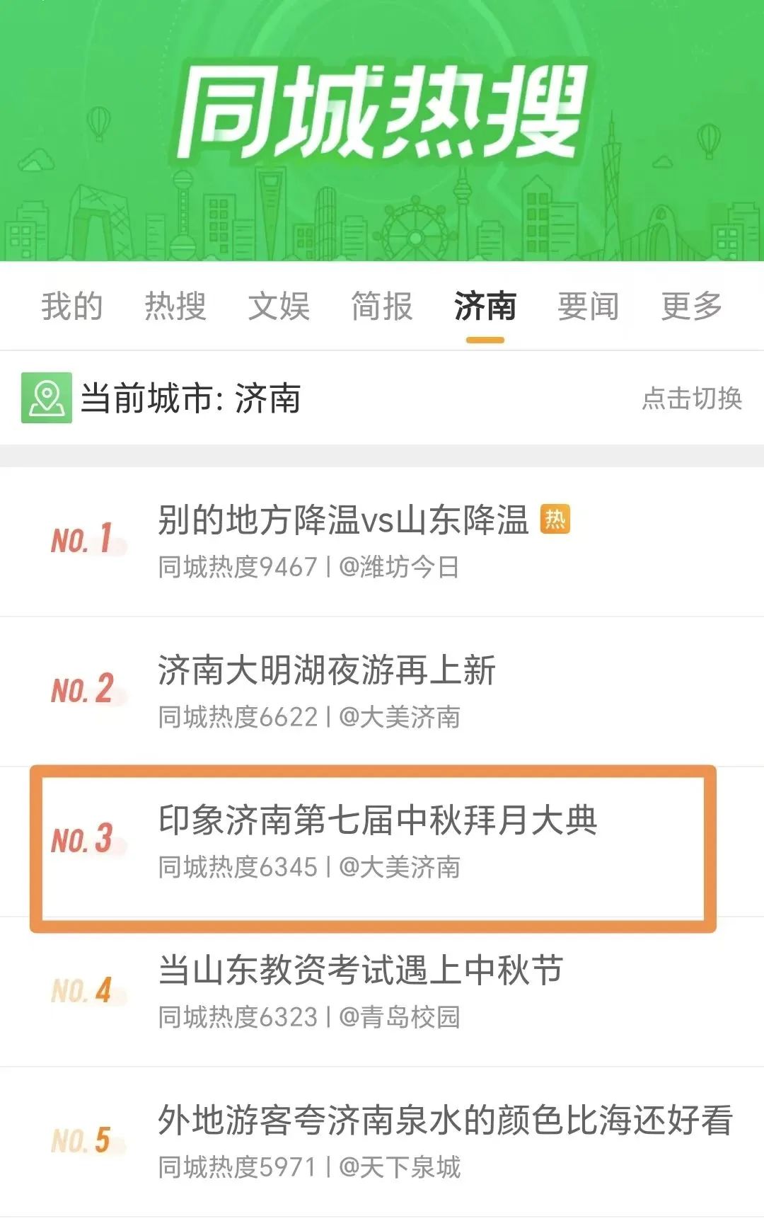 #印象濟(jì)南第七屆中秋拜月大典#作為微博熱搜話題,登錄同城熱搜榜第三位,閱讀量超25萬(wàn)次。
