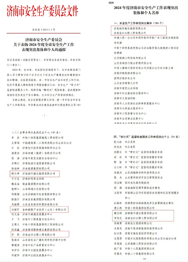 近日,濟南市安全生產(chǎn)委員會印發(fā)《關(guān)于表揚2024年度全市安全生產(chǎn)工作表現(xiàn)突出集體和個人的通報》,濟南城市建設(shè)集團及集團所屬山東金曰交通發(fā)展集團被評為安全生產(chǎn)工作表現(xiàn)突出集體,3名同志被評為安全生產(chǎn)工作表現(xiàn)突出個人,2名同志被評為“審計式”監(jiān)督檢查服務(wù)工作表現(xiàn)突出個人。