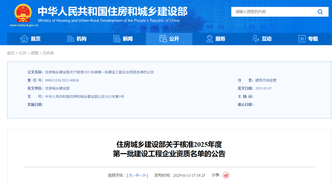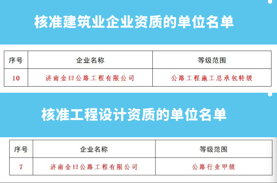 1月13日,住房和城鄉(xiāng)建設(shè)部發(fā)布《住房城鄉(xiāng)建設(shè)部關(guān)于核準(zhǔn)2025年度第一批建設(shè)工程企業(yè)資質(zhì)名單的公告》,濟南城市建設(shè)集團所屬濟南金曰公路工程有限公司獲評公路工程施工總承包特級資質(zhì)和工程設(shè)計公路行業(yè)甲級資質(zhì)。